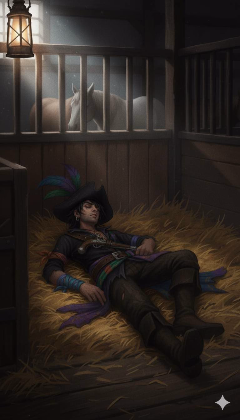 After defeating the giant, The Pyros broke up. Scrabble joined a pirate ship (the Flying Harpy) at Messori Harbor. On the ship Scrabble met Flint, The Red Moon Reaver. They engaged in some pirating off the coast of the Magocracy of Allain. After a year they have found themselves at pirating the Nieder Straits. Scrabble and Flint are friendly, but not close friends; they work together well. The Flying Harpy attacked a research vessel and Treb and the rest of the crew of the research vessel. Treb was just on the research vessel to get away from his past so he signs the book and joins the crew of The Flying Harpy. Treb is at the bottom rung of the crew as the newest member. The ship has pulled into port at Stannisgard and the crew is on shore leave.