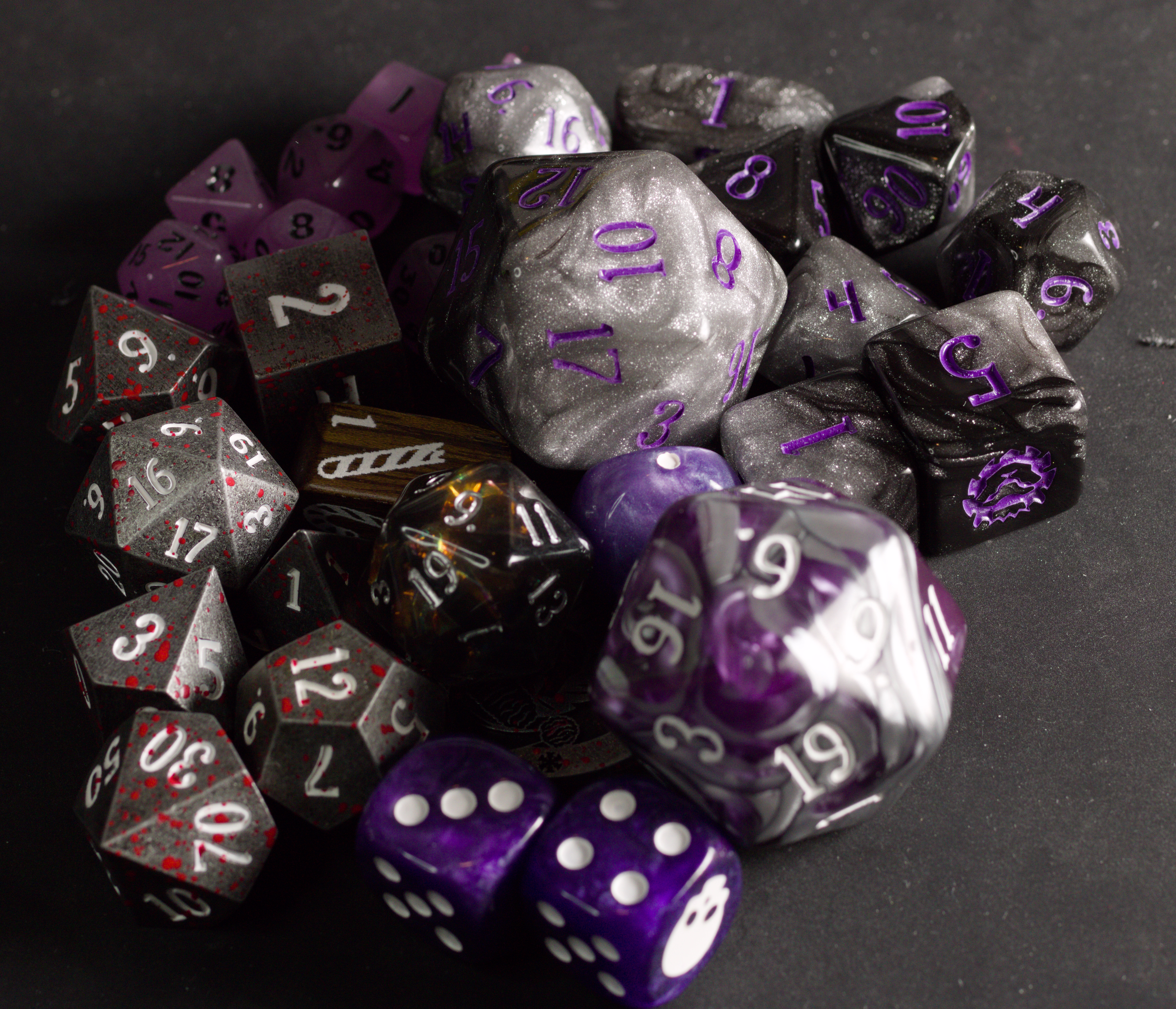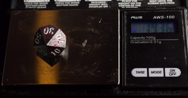 Partway through the calendar I started thinking about how differently the dice felt in my hand. I was curious just how much heavier the metal dice were. I was also curious about the the size ration between the chonky and normal-size dice.