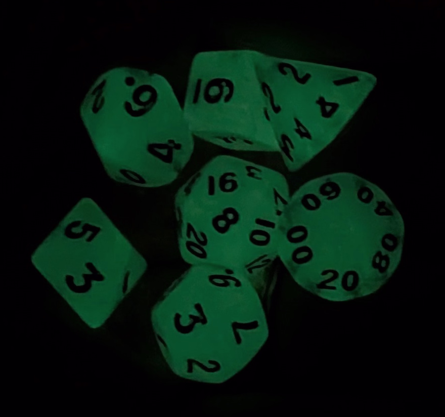 But there was a hidden surprise here! When I was done taking the photos and turned off the lights, the dice looked green. It took me a second to realize they were glow-in-the-dark dice. I went into one of the rooms that didn’t have any windows and took this photo with the lights turned off:
